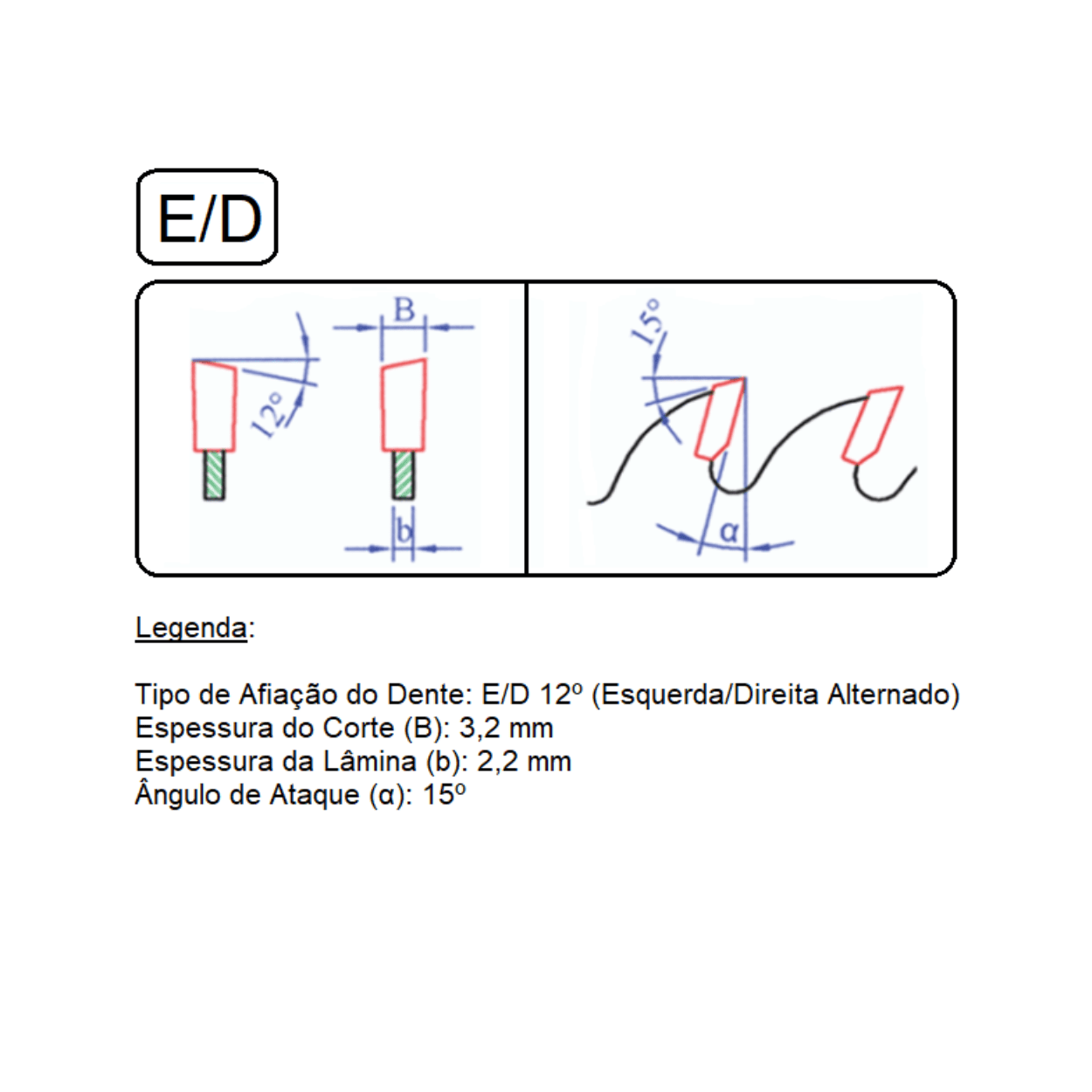 Tipo de Afiação do Dente: ED (Esquerda/Direita Alternado);