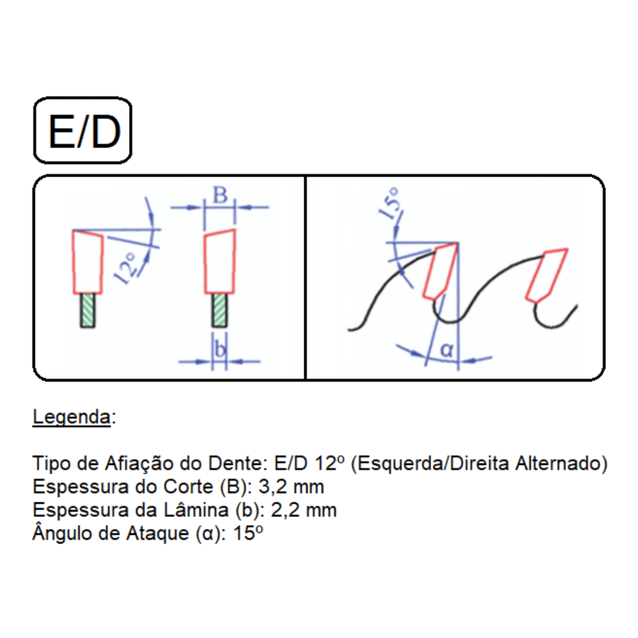 Tipo de Afiação do Dente: ED (Esquerda/Direita Alternado);