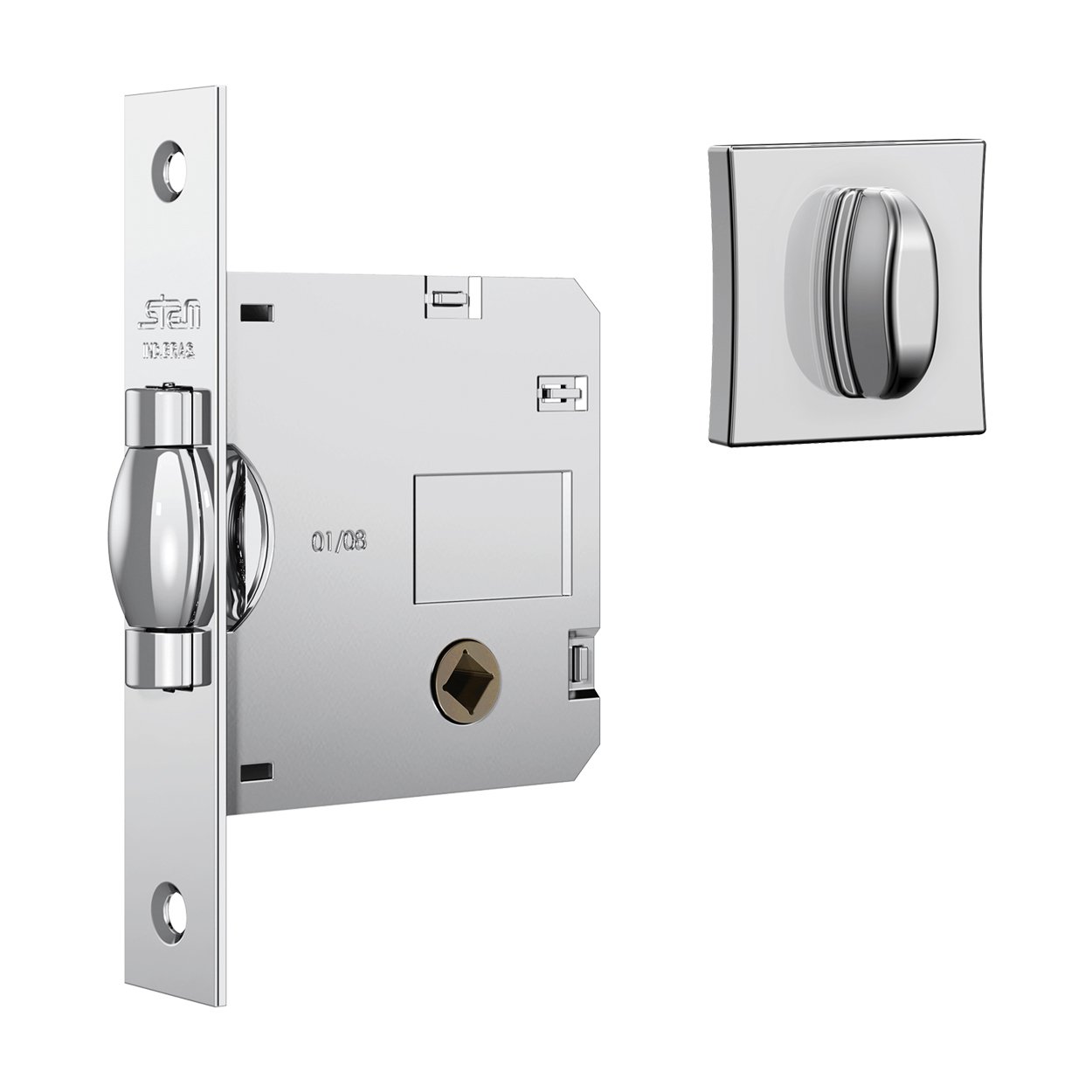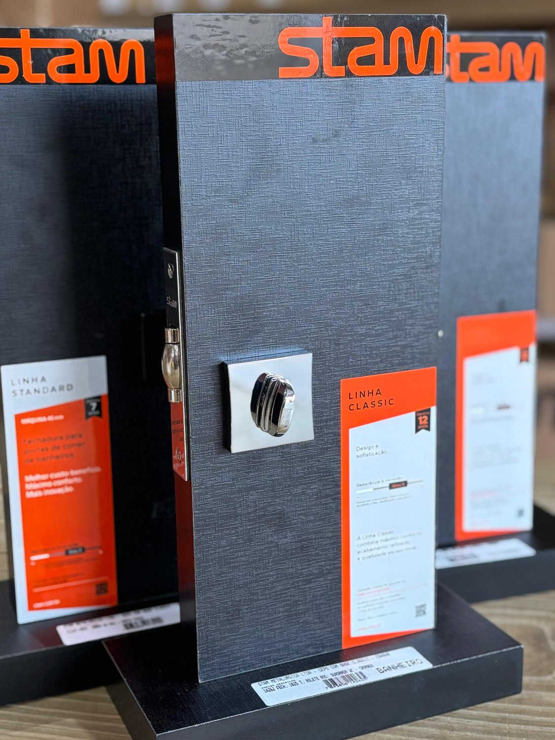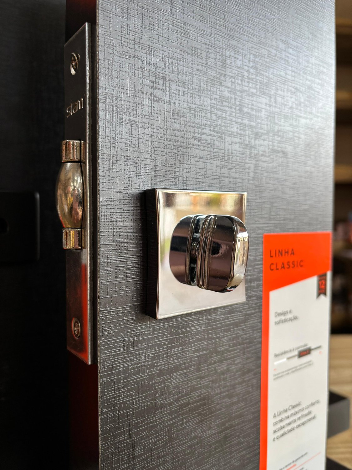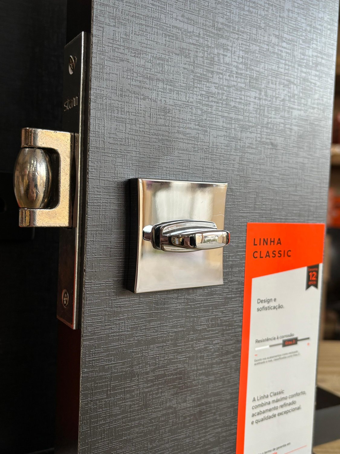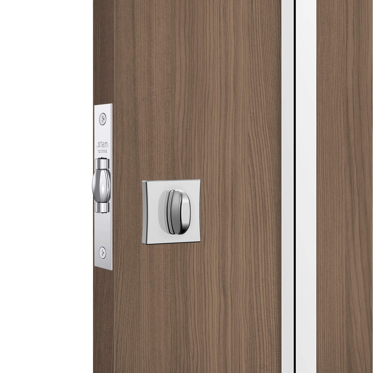 -Fechadura Pivotante Trinco Rolete para porta de banheiro; chave fixa para o lado interno da porta, e acompanha uma chave reserva.